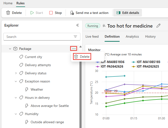 選取溫度規則,稱為「太熱以致於不能使用於醫療」。 在最右邊的窗格中,請參閱 [定義 ] 窗格,以查看規則的運作方式。