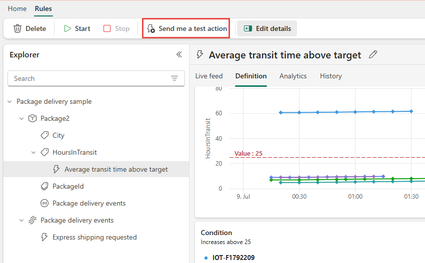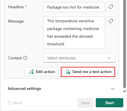 要測試您的規則,請選擇 [傳送測試動作] 按鈕。 請確定您收到警示。 如果使用電子郵件,可能需要一兩分鐘的時間才能到達。