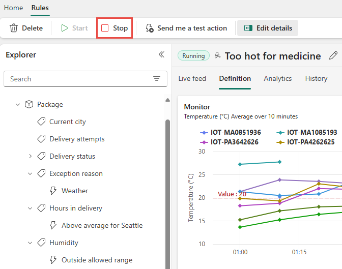 完成在教學課程中建立的規則之後,請務必停止它們。 如果您未停止規則,您會繼續接收規則通知。 您也可能會產生背景處理所需費用。 接著選取每個規則,然後從功能區選取 [ 停止 ] 按鈕。