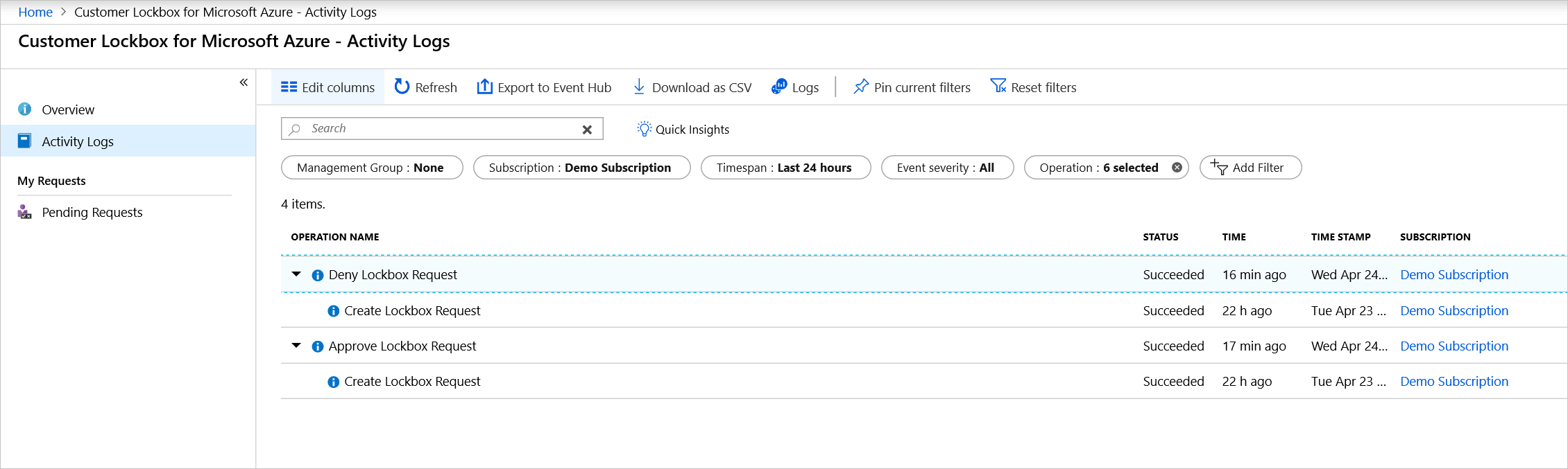 若要存取活動記錄,請在 Azure 入口網站選取 [活動記錄]。 您可以篩選特定動作的結果。