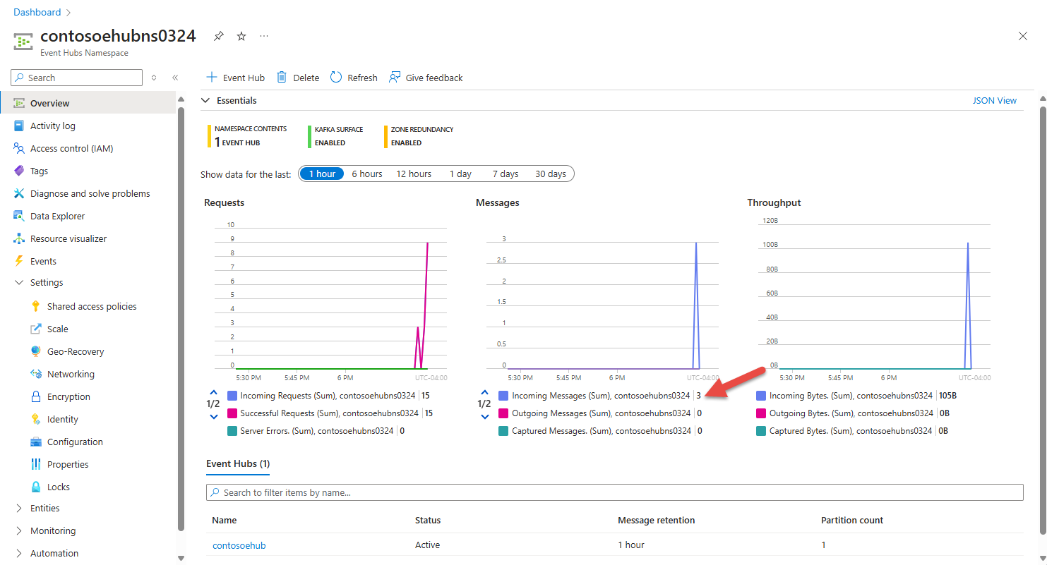 執行 Kafka 應用程式,以將事件傳送至事件中樞。 然後,使用 Azure 入口網站確認事件中樞會接收事件。 在事件中樞命名空間的 [概觀] 頁面上,切換至 [計量] 區段中的 [訊息] 檢視。 請重新整理頁面來更新圖表。 可能需要幾秒鐘的時間,才會顯示已接收訊息。