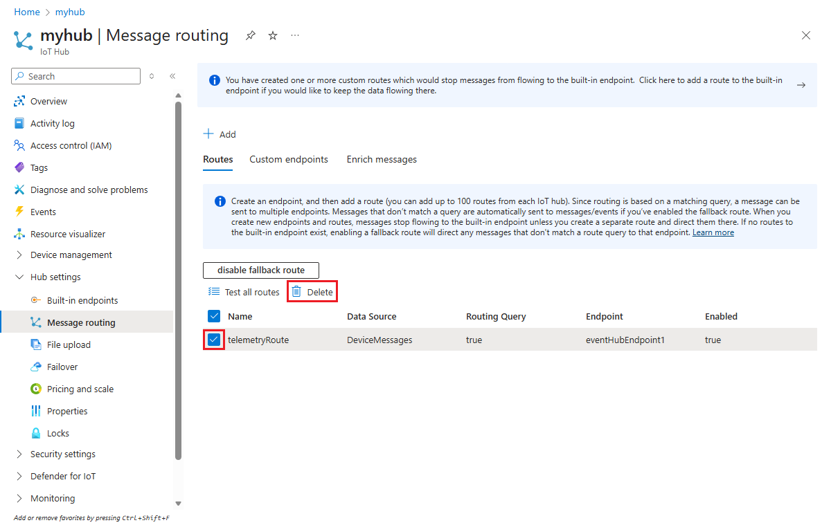 本文說明如何在 Azure IoT 中樞的中樞中建立路由和端點,然後刪除您的路由和端點。 深入了解如何使用 Azure 入口網站來為 Azure 事件中樞、Azure 服務匯流排佇列、主題、 Azure 儲存體和 Azure Cosmos DB 建立路由和端點。