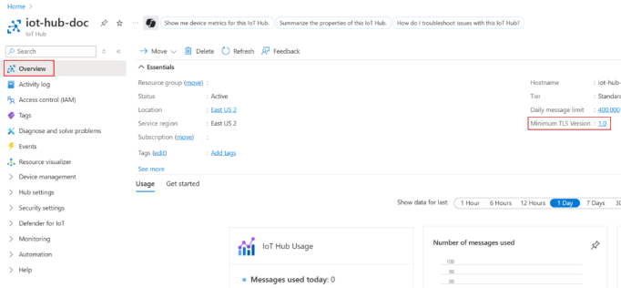 建立IoT中樞之後, minTlsVersion 就可以使用 Azure 入口網站、CLI 或 SDK 來更新屬性。 如果您需要更新以強制IoT中樞使用TS 1.2和強式加密套件(僅在選取的區域中允許),或設定TLS 1.2支援(在所有區域支援),您可以遵循下列步驟。