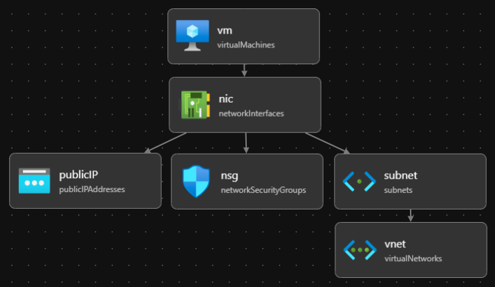 Bicep Visualizer 會顯示 Bicep 檔案中定義的資源與其相依性。 下圖是 Linux 虛擬機器 Bicep 檔案的視覺化表示。