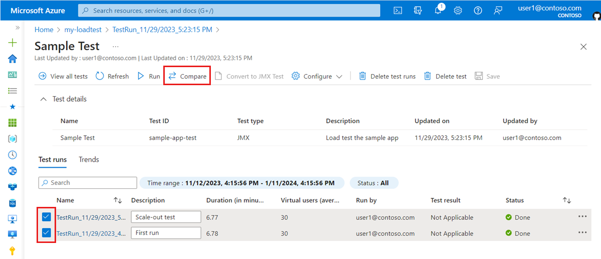 選取兩個或多個測試回合,然後選取 [比較 ] 以比較測試回合。