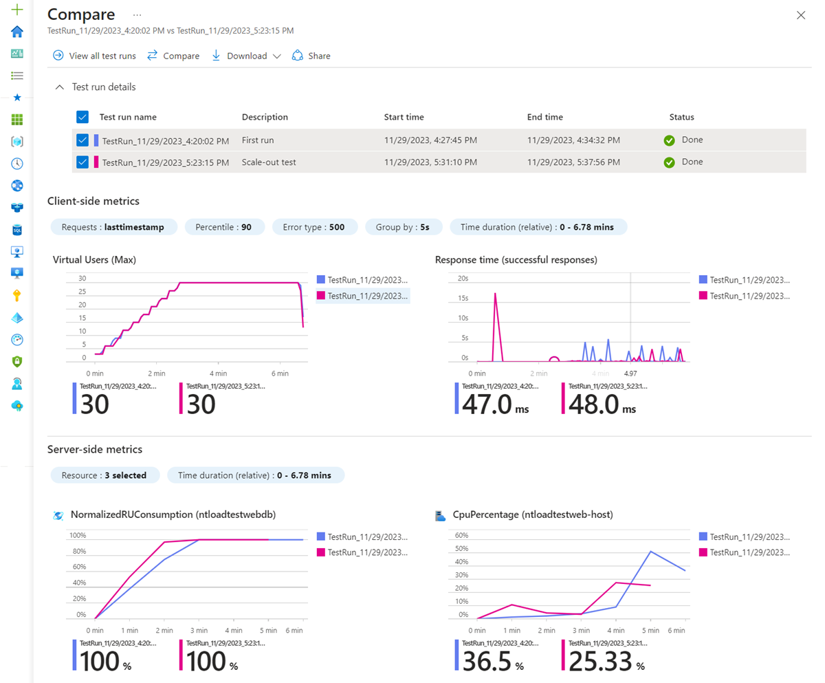 若要比較客戶端和伺服器端計量,您可以選取最多十個測試回合,然後在 Azure 負載測試儀錶板中加以比較。 儀錶板會針對每個測試回合重疊客戶端和伺服器端計量圖表。 藉由比較儀錶板中的伺服器端應用程式計量,您可以識別哪些應用程式元件是突然效能降低的根本原因。