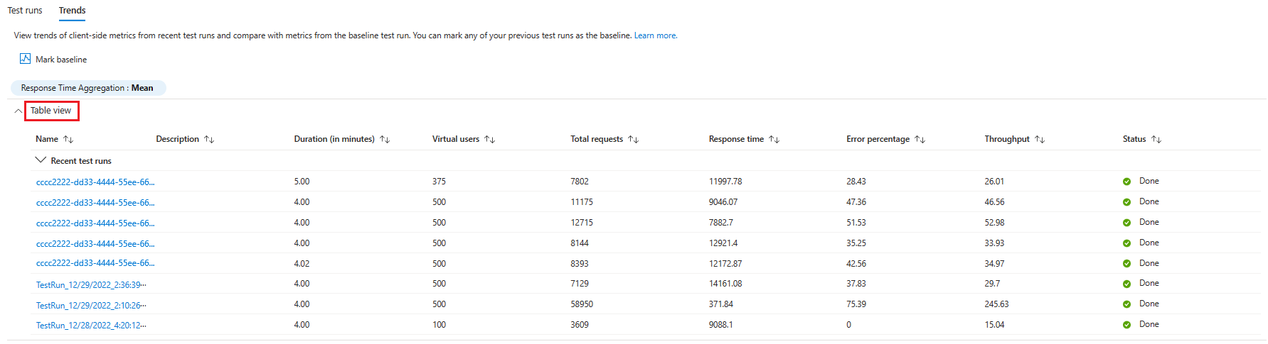 當您想要比較用戶端計量趨勢與特定參考測試回合時,您可以將該測試回合標示為基準。 例如,在應用程式中實作效能優化之前,您可以先建立基準負載測試回合,然後驗證優化對基準的影響。