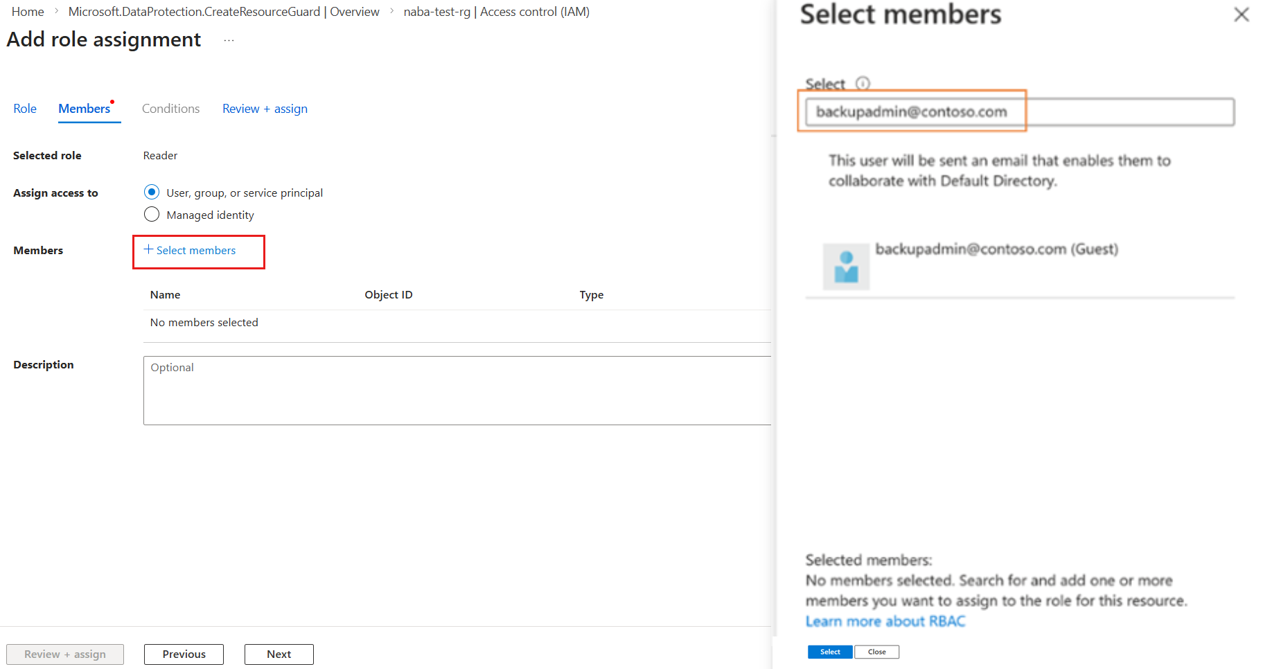 按一下 [選取成員] 並加入備份管理員的電子郵件識別碼,以將其新增為 [讀取程式]。 由於備份管理員在本案例中位於另一個租用戶中,因此他們將作為來賓新增到包含資源防護的租用戶中。