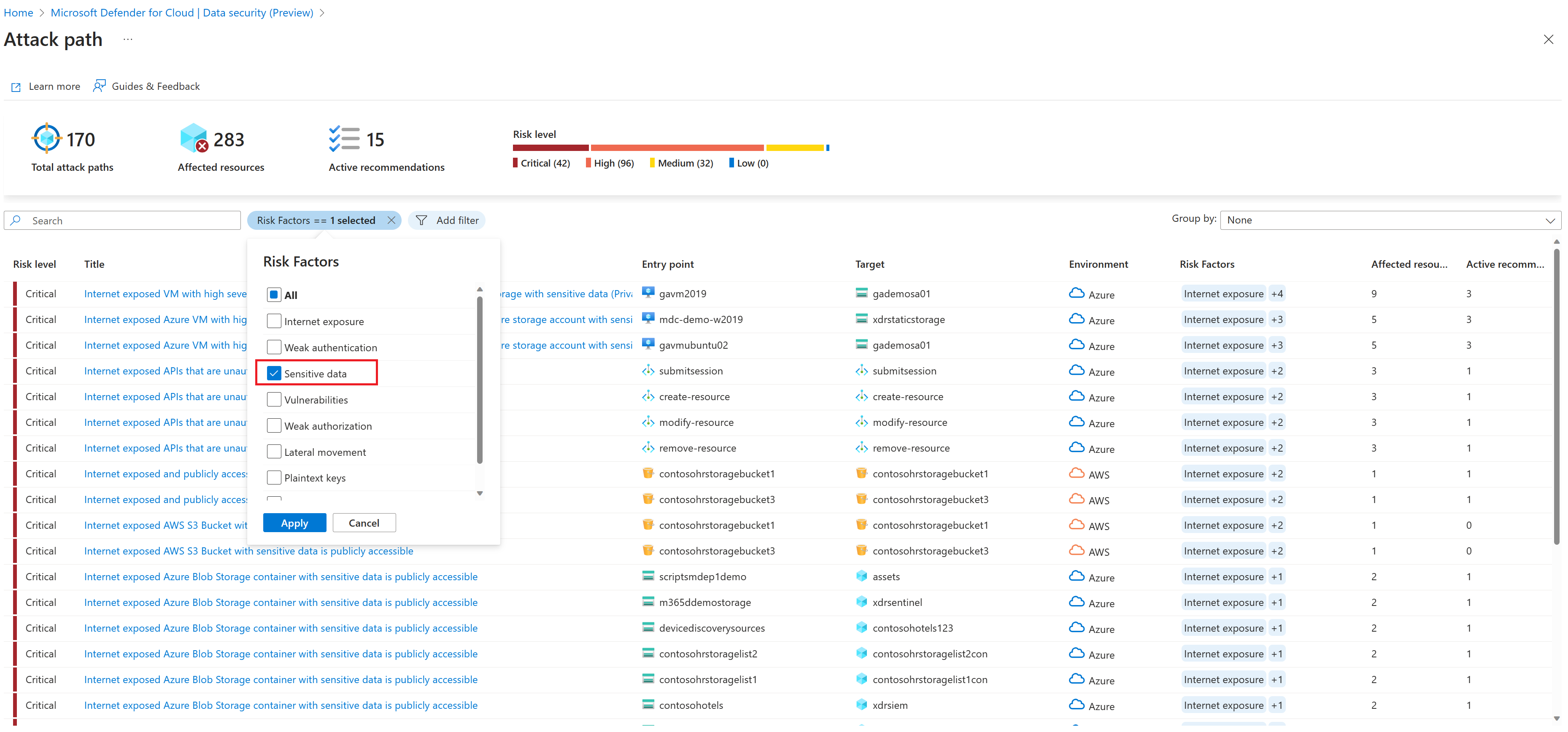 依 [風險因素] 進行篩選,然後選取 [ 敏感數據 ] 來篩選數據相關的攻擊路徑。