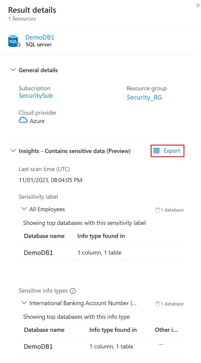 若要檢視數據資源中偵測到的敏感性資訊,請選取資源名稱 >Insights。 然後,展開 [ 包含敏感數據 深入解析]。