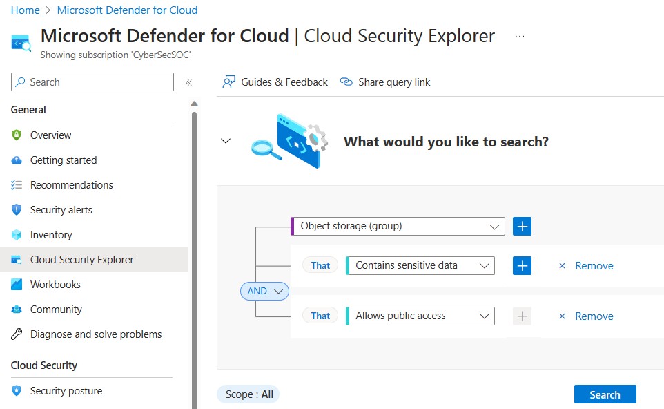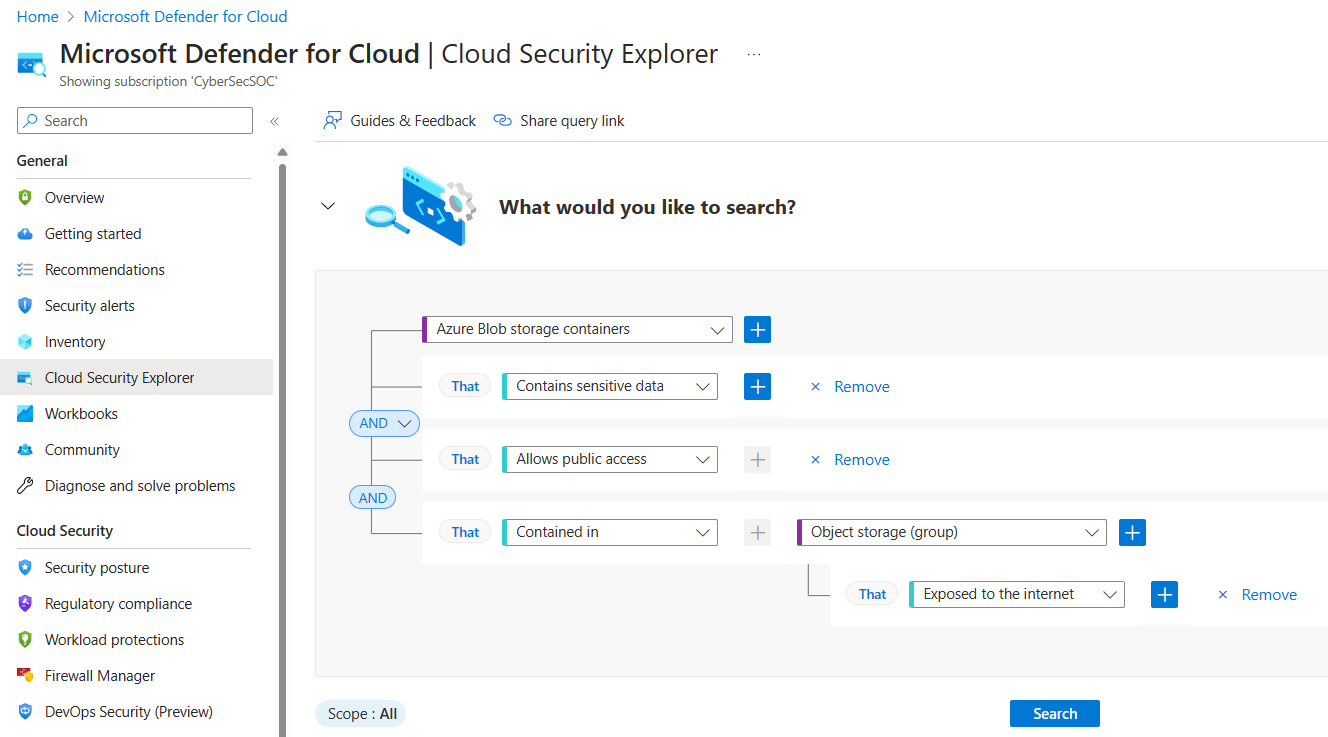- 安全性總管:在 Defender CSPM 方案中啟用敏感數據探索時,您可以使用 Cloud Security Explorer 來尋找敏感數據深入解析。 如需詳細資訊,請參閱 Defender CSPM 中的資料安全性態勢管理。