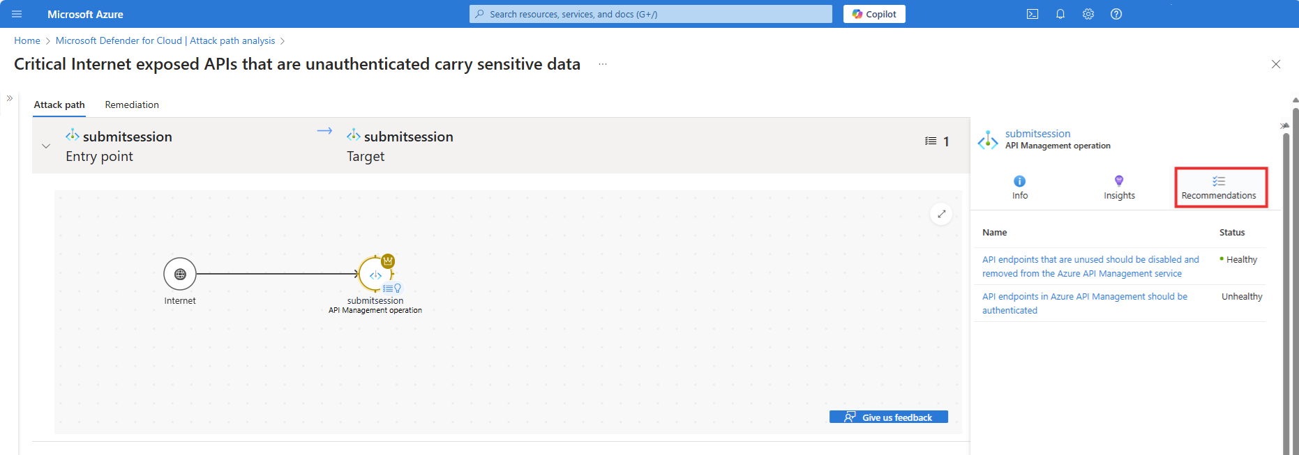 若要調查 API 安全性態勢建議: