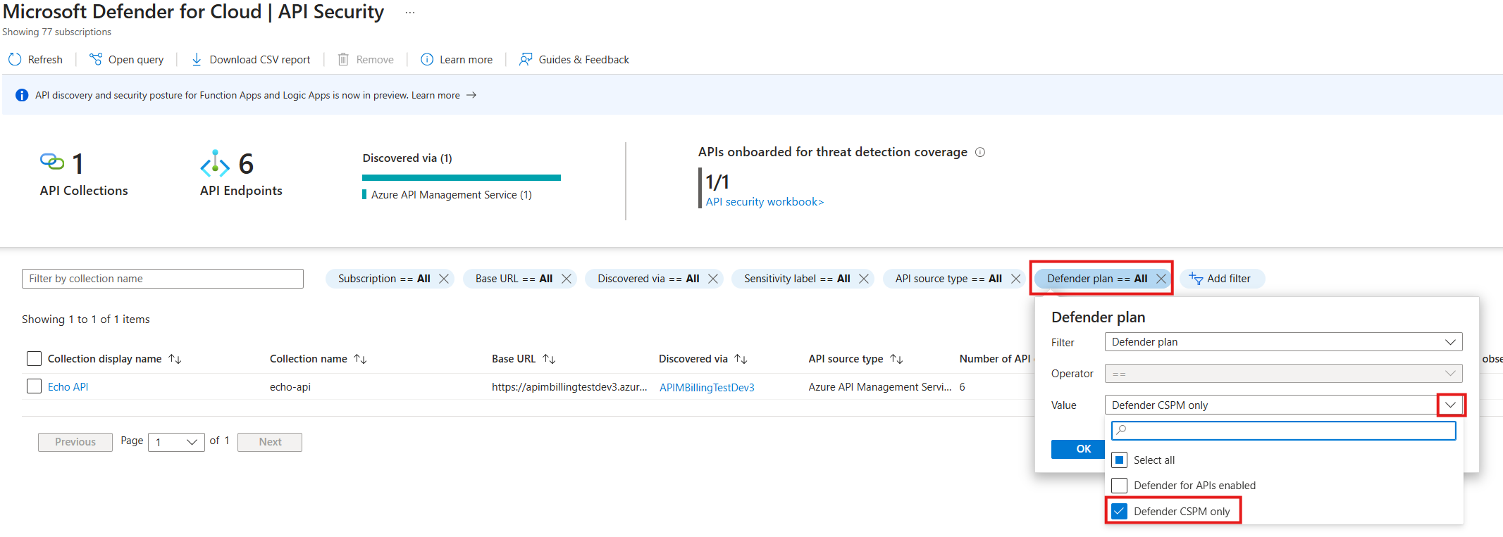 套用篩選條件 Defender 計畫 == Defender CSPM 以查看已加入 Defender CSPM 計畫的 API。