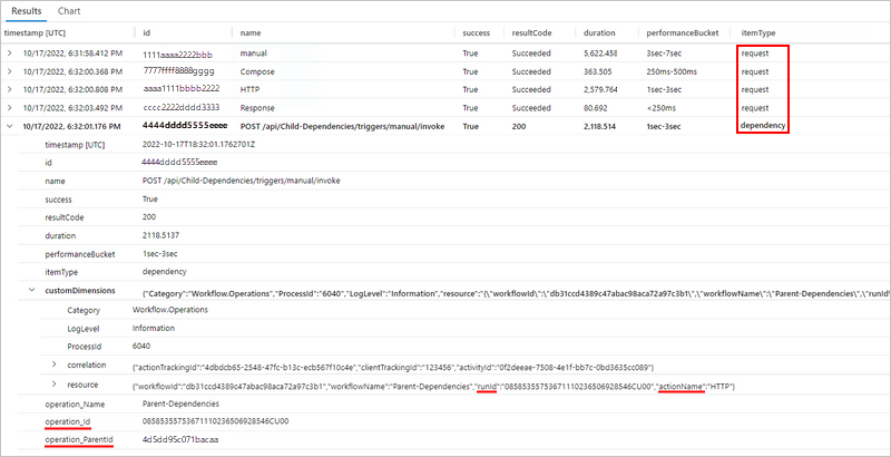 union requests, dependencies | where operation_Id contains "<runId>"此查詢會使用 union 運算子,從要求資料表和相依性資料表傳回記錄。 查詢也會使用 operation_Id 屬性值,藉由指定您想要的工作流程 runId 值來提供記錄之間的連結,例如:
