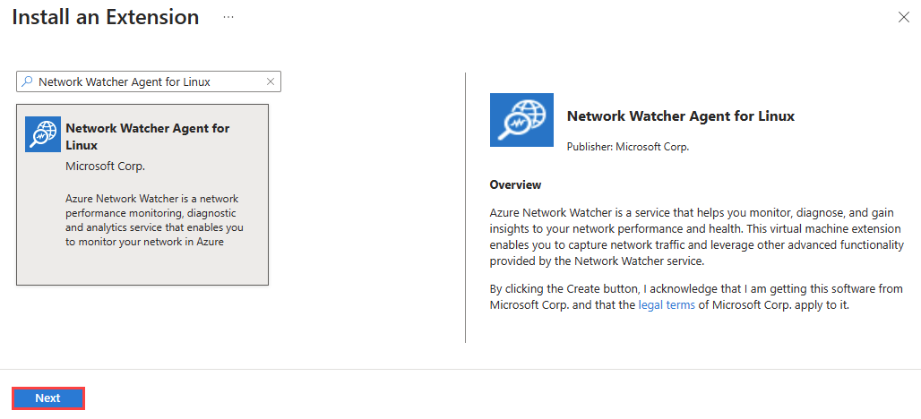3. 在 [安裝延伸模組] 的搜尋方塊中,輸入適用於 Linux 的網路監看員代理程式。 從清單中選取延伸模組,然後選取 [下一步]