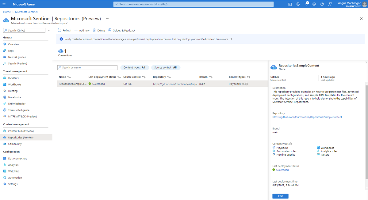 - 每個Microsoft Sentinel工作區目前限制為五個儲存庫連線。