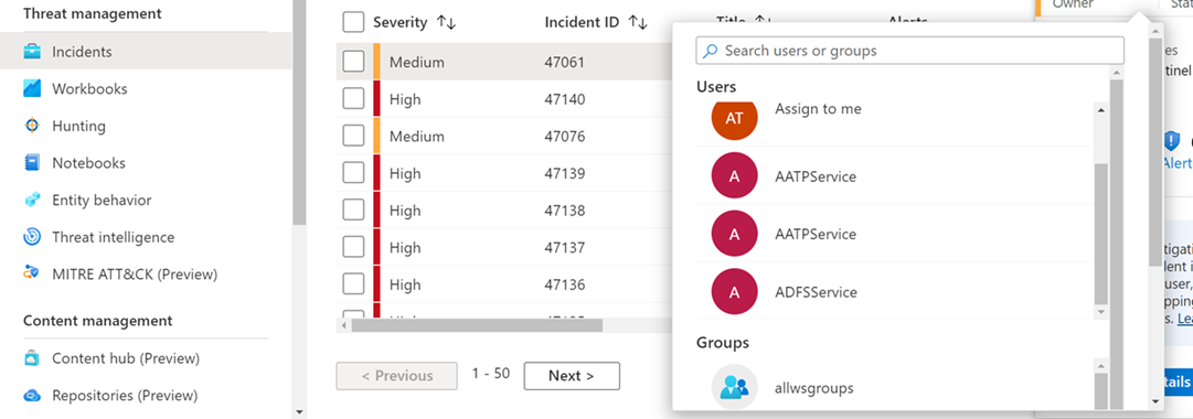 使用 [Microsoft Sentinel 事件] 頁面來指派事件。 [ 事件] 頁面包含事件預覽,以及單一事件的詳細檢視。
