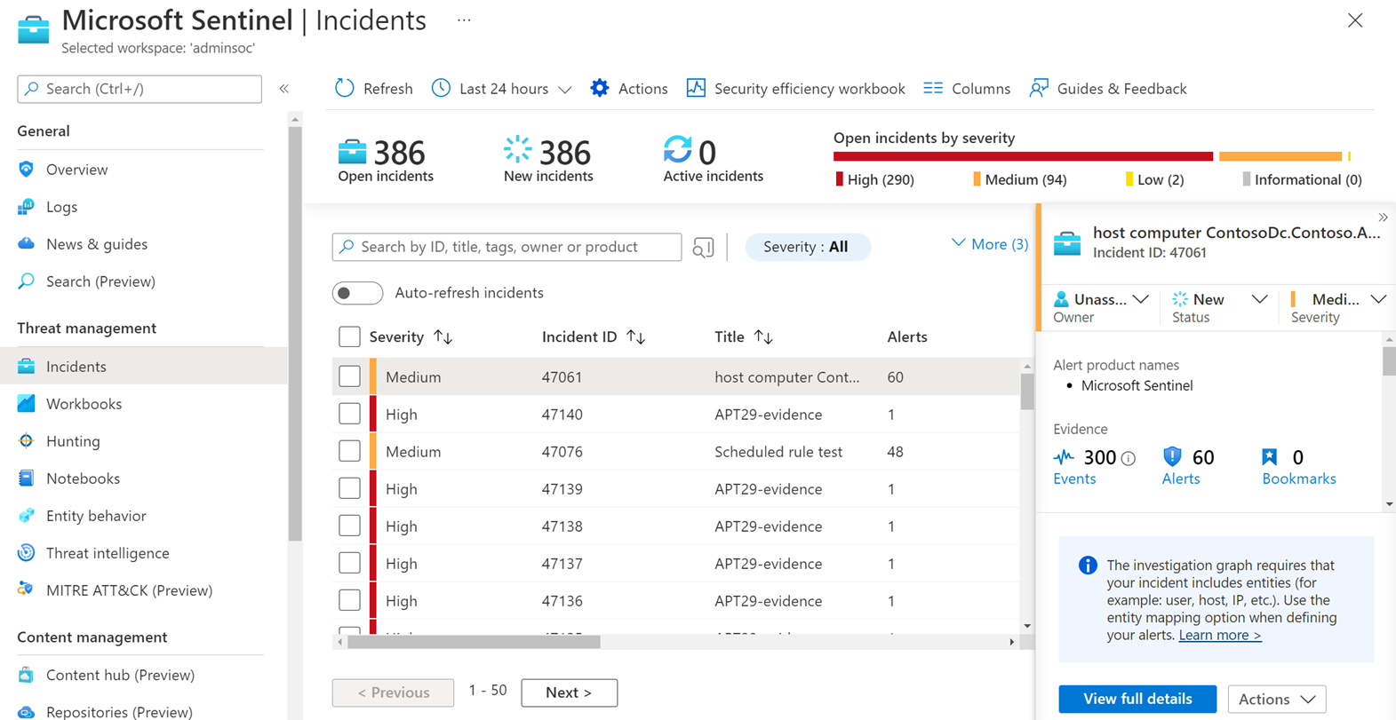 若要在Microsoft Sentinel 中執行分級練習,您可以從各種Microsoft Sentinel 功能開始,視您正在調查的事件程度和性質而定。 在典型的起點上,選取 [事件] 頁面中的 [檢視完整詳細數據]。 您現在可以檢查組成事件的警示、檢閱書籤、選取實體以進一步向下切入至特定實體,或新增批注。