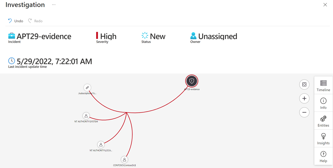 使用調查圖表來深入調查事件。 從 [ 事件] 頁面中,選取事件,然後選取 [ 調查 ] 以檢視 調查圖表。
