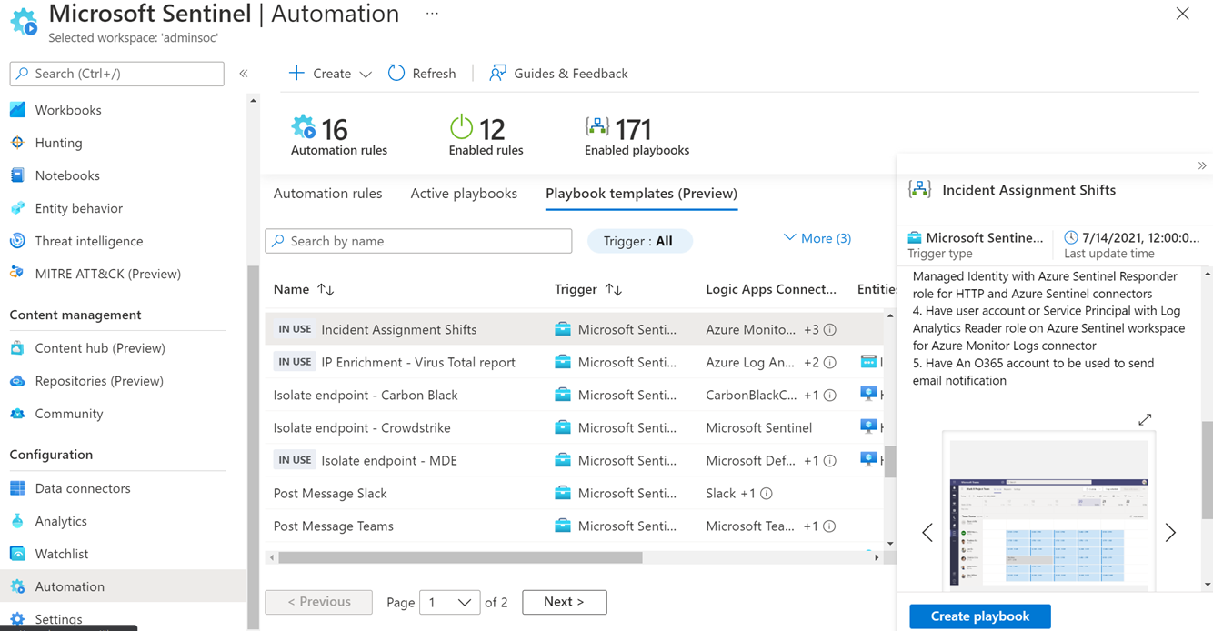 這些來源包含廣泛的安全性導向劇本,以涵蓋各種複雜度使用案例。 若要簡化使用劇本的工作,請使用自動化>劇本範本下的範本。 範本可讓您輕鬆地將劇本部署到 Microsoft Sentinel 實例,然後修改劇本以符合貴組織的需求。
