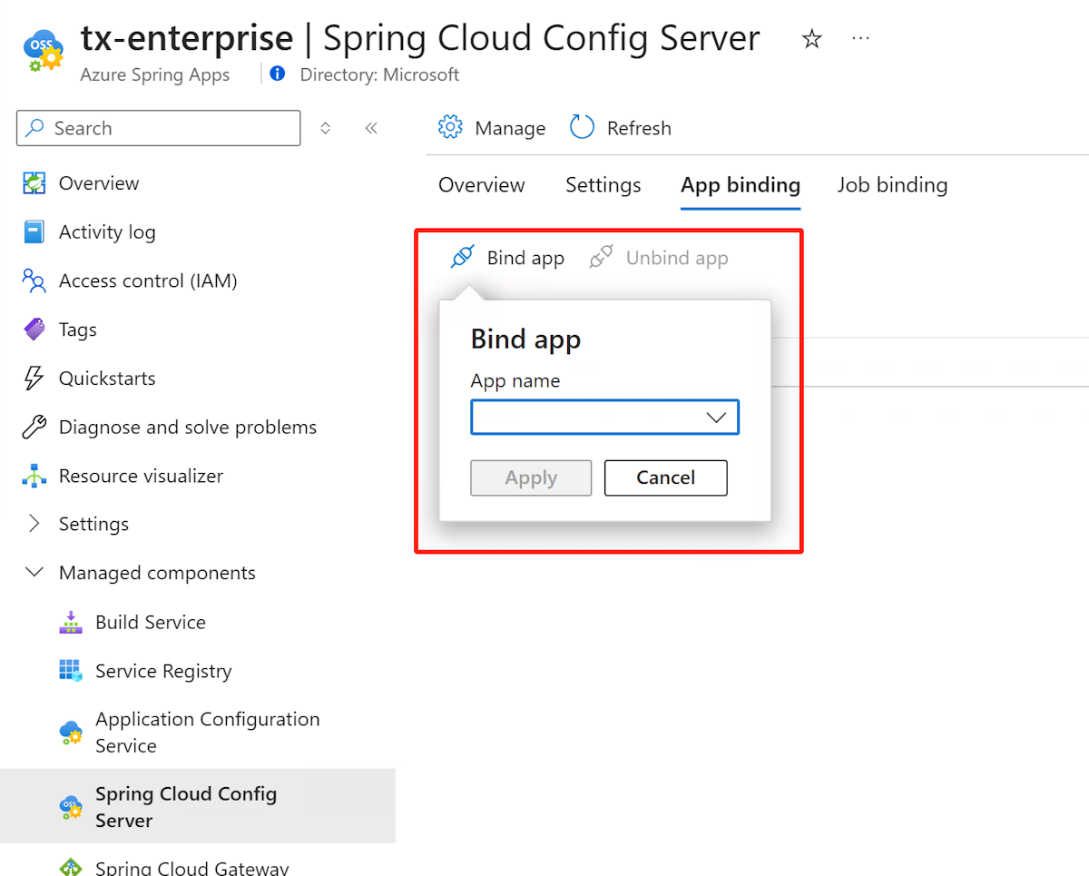 您現在可以選擇使用下列命令,直接將應用程式系結至 Spring Cloud Config Server: