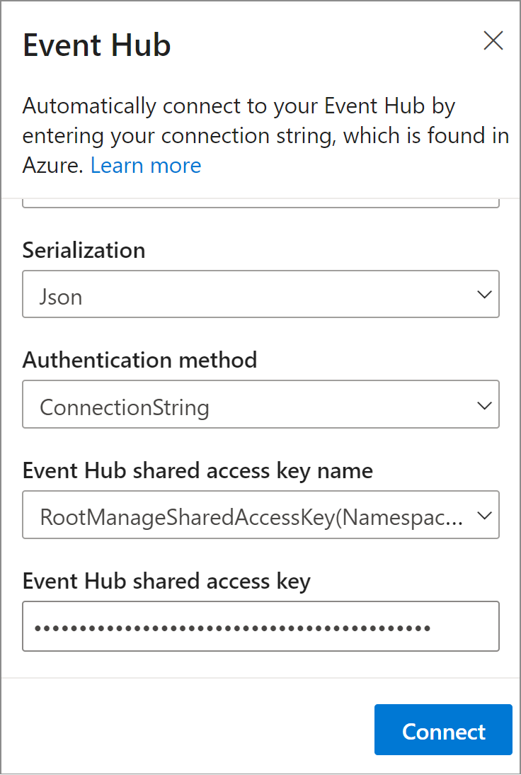 在 [事件中樞] 視窗中指定資料的 [序列化] 類型,以及作業要用於連線至事件中樞的 [驗證方法]。 然後選取 [連線]。