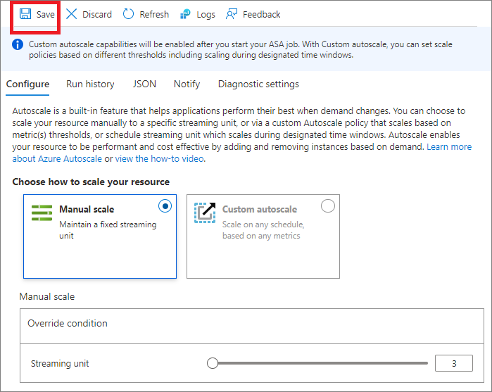 自訂自動調整可讓您指定工作的串流單位數目下限和上限,以根據您的規則定義進行動態調整。 自訂自動調整會檢查預先設定的規則集。 然後,系統會決定新增 SU 來處理增加的負載,或在計算資源閒置時減少 SU 數目。 如需 Azure 監視器中自動調整的詳細資訊,請參閱 Microsoft Azure 中的自動調整概觀。