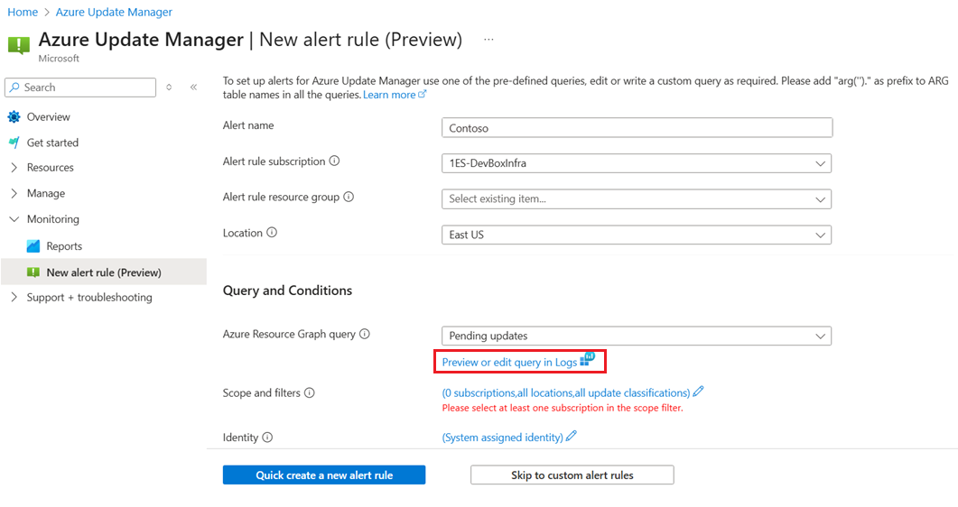 本文提供使用 Azure 更新管理員啟用警示 (預覽) 的步驟,以處理更新資料中所擷取的事件。