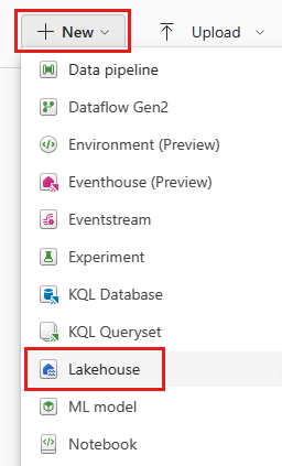 - 您也可以使用 [新增] 下拉式功能表,透過 [資料工程] 中的工作區檢視建立 Lakehouse。