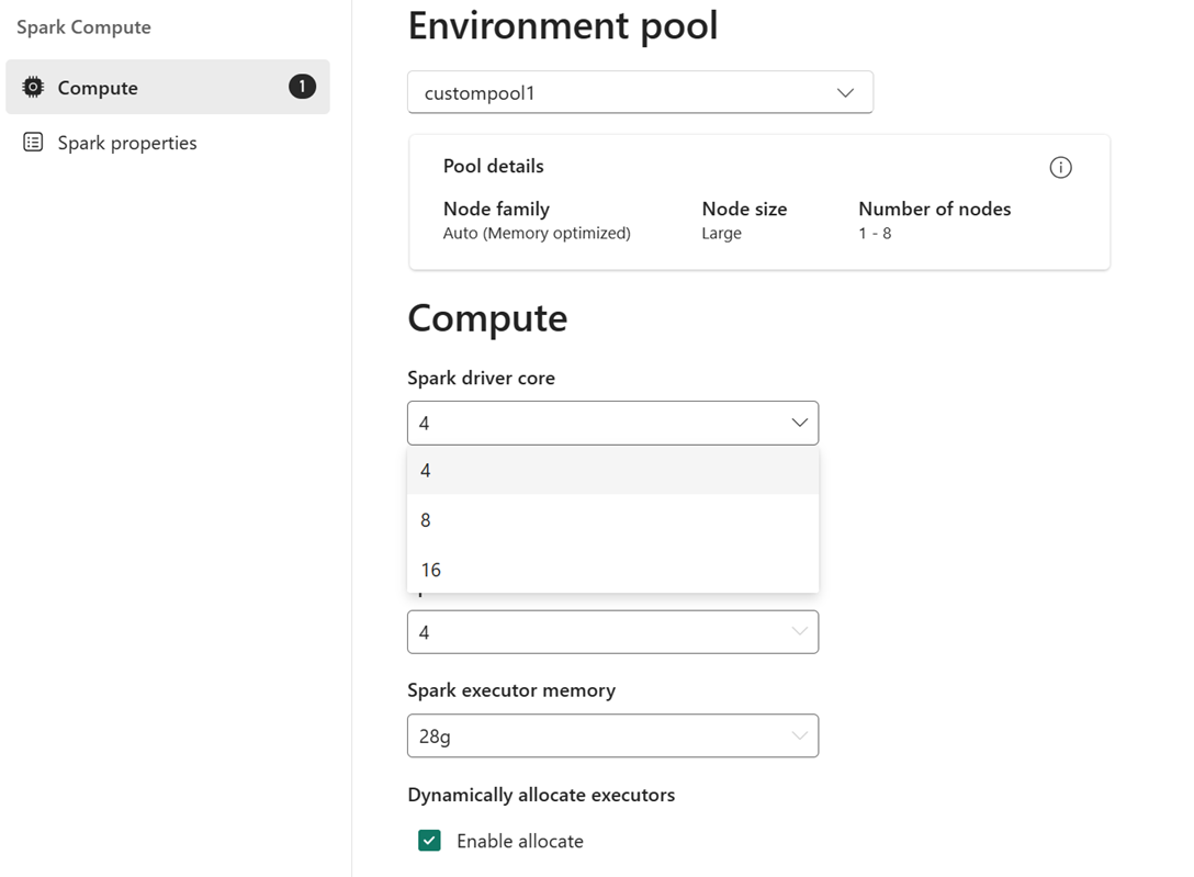 在 [ 計算 ] 區段的 [ 環境集區] 下,使用 Spark驅動程式核心 下拉式清單,根據您的作業層級需求選擇 4、 8或 16。