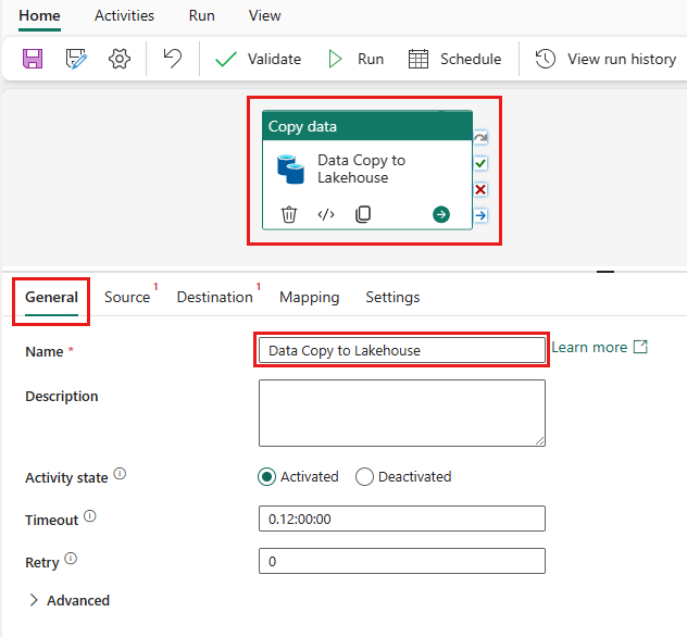 從畫布中選取新新增的複製資料活動。 活動屬性會顯示在畫布下方的窗格中 (您可能需要拖曳頂端邊緣來向上展開窗格)。 從屬性窗格的 [一般] 索引標籤中,在 [名稱] 欄位中輸入 [資料複製至 Lakehouse]。 將其餘內容保留為預設值。