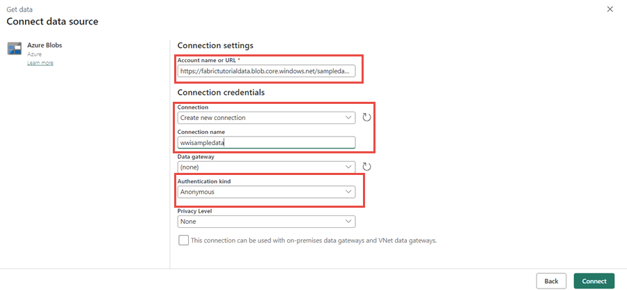 屬性 價值 帳戶名稱或網址 https://fabrictutorialdata.blob.core.windows.net/sampledata/連線 建立新連線 連線名稱 wwisampledata 驗證種類 匿名 建立新連線後,請返回 Source copy data 活動的索引標籤,預設會選取新建立的連線。 在移至目的地設定之前,請指定下列內容。