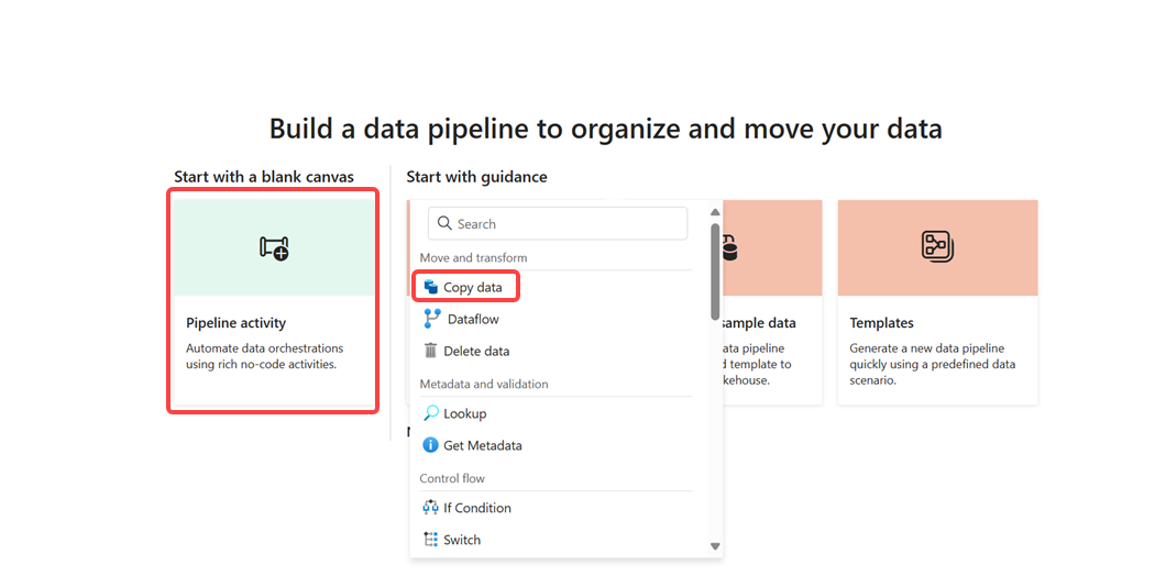 從新建立的管線中,選取 管線活動 以將活動新增至管線,然後選取 複製資料。 此動作會將複製資料活動新增至管線畫布。