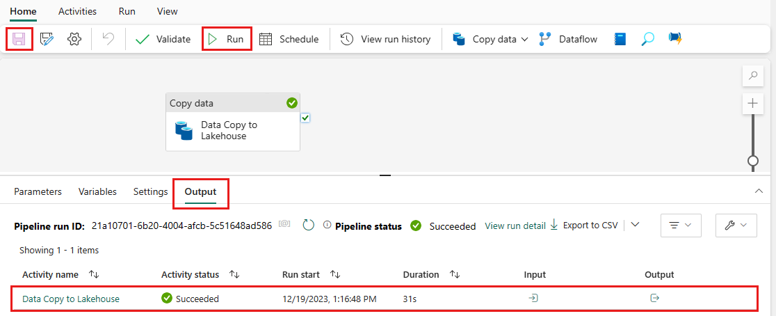 此動作會觸發從基礎資料來源到指定 Lakehouse 的資料複製,最多可能需要一分鐘的時間才能完成。 您可以在 [輸出] 索引標籤下監視管線的執行及其活動。活動狀態會從 [佇列]> [進行>中] [成功] 變更。