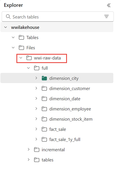 複製活動成功之後,請開啟您的湖庫 (wwilakehouse) 以檢視資料。 重新整理 [檔案] 區段以查看擷取的資料。 檔案區段中會出現新的資料夾 wwi-raw-data ,而 Azure Blob 資料表的資料會複製到該處。