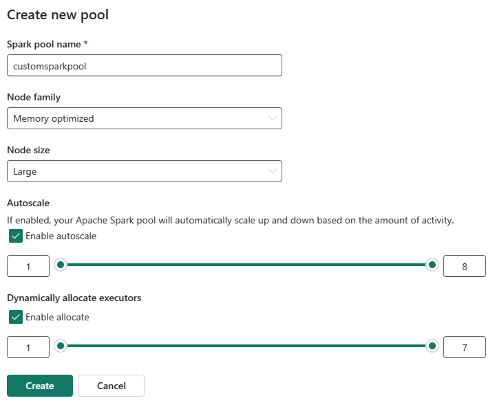 管理員可以選取 [新增集區] 選項,根據計算需求建立自訂 Spark 集區。