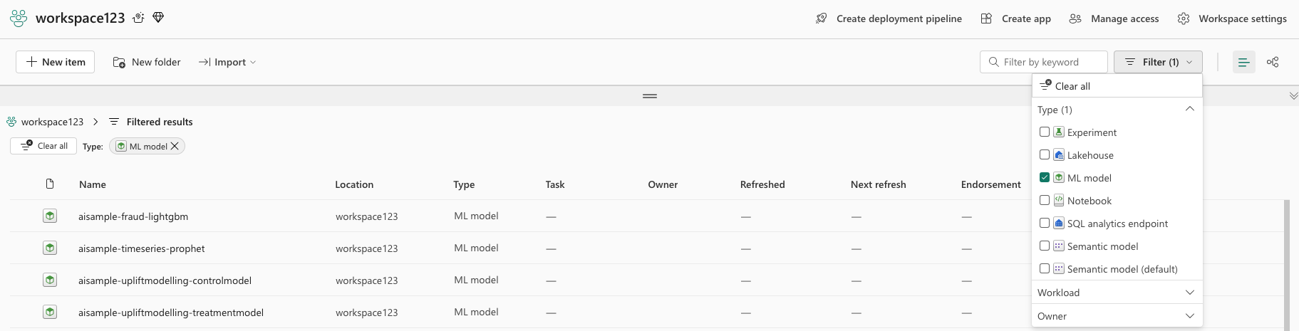 - 使用 Scikit-learn、LightGBM 和 MLflow 訓練機器學習模型,並使用 Fabric 自動記錄功能追蹤實驗
