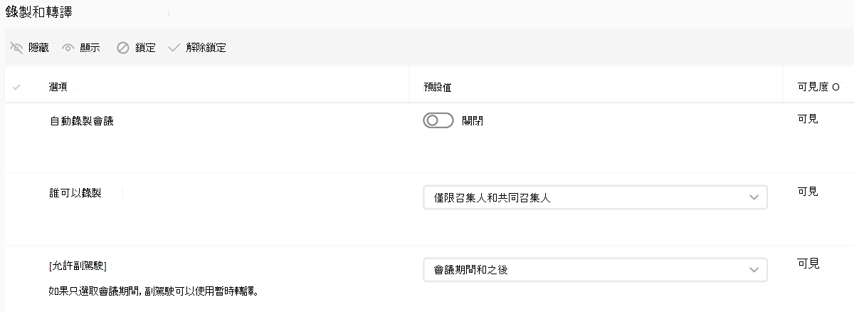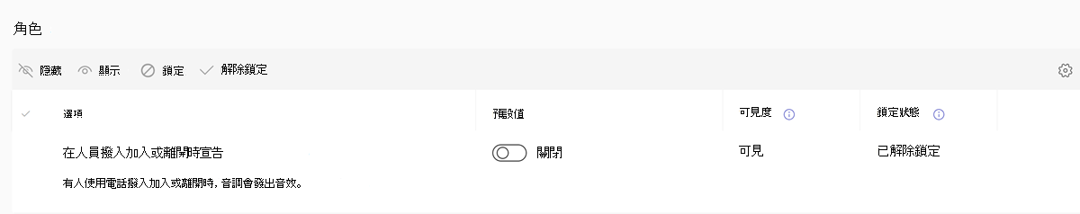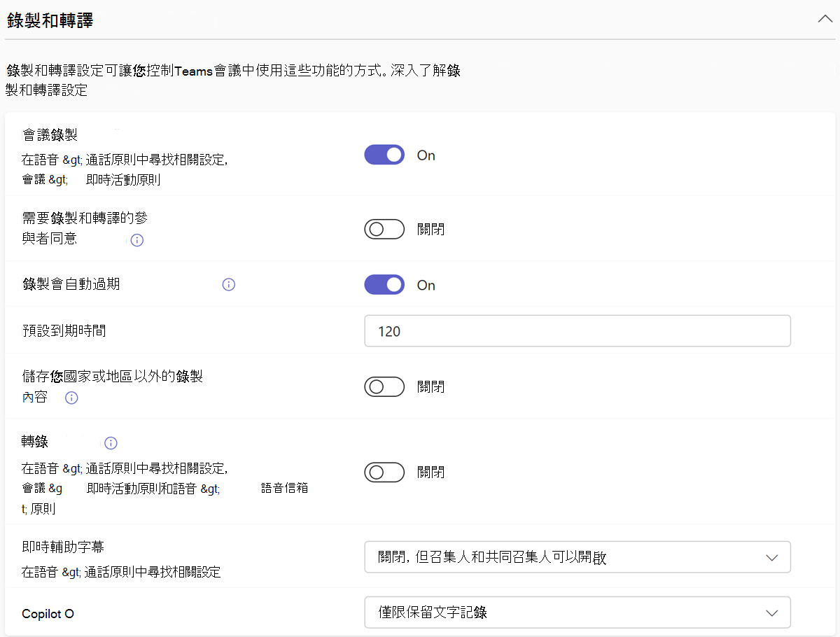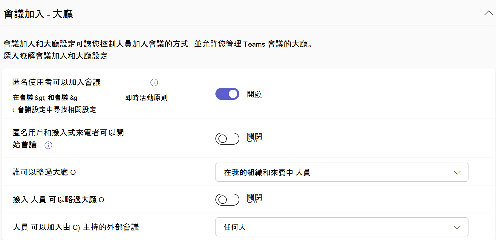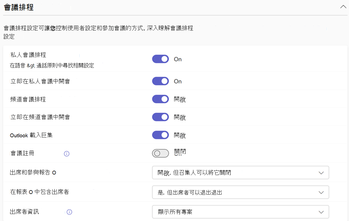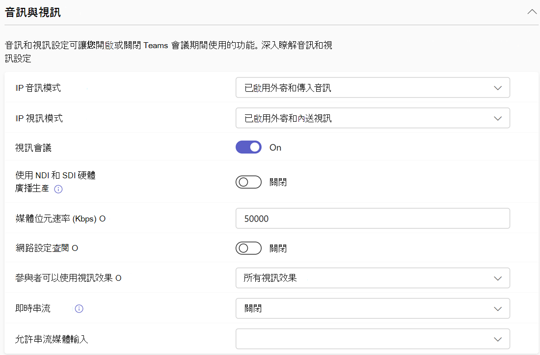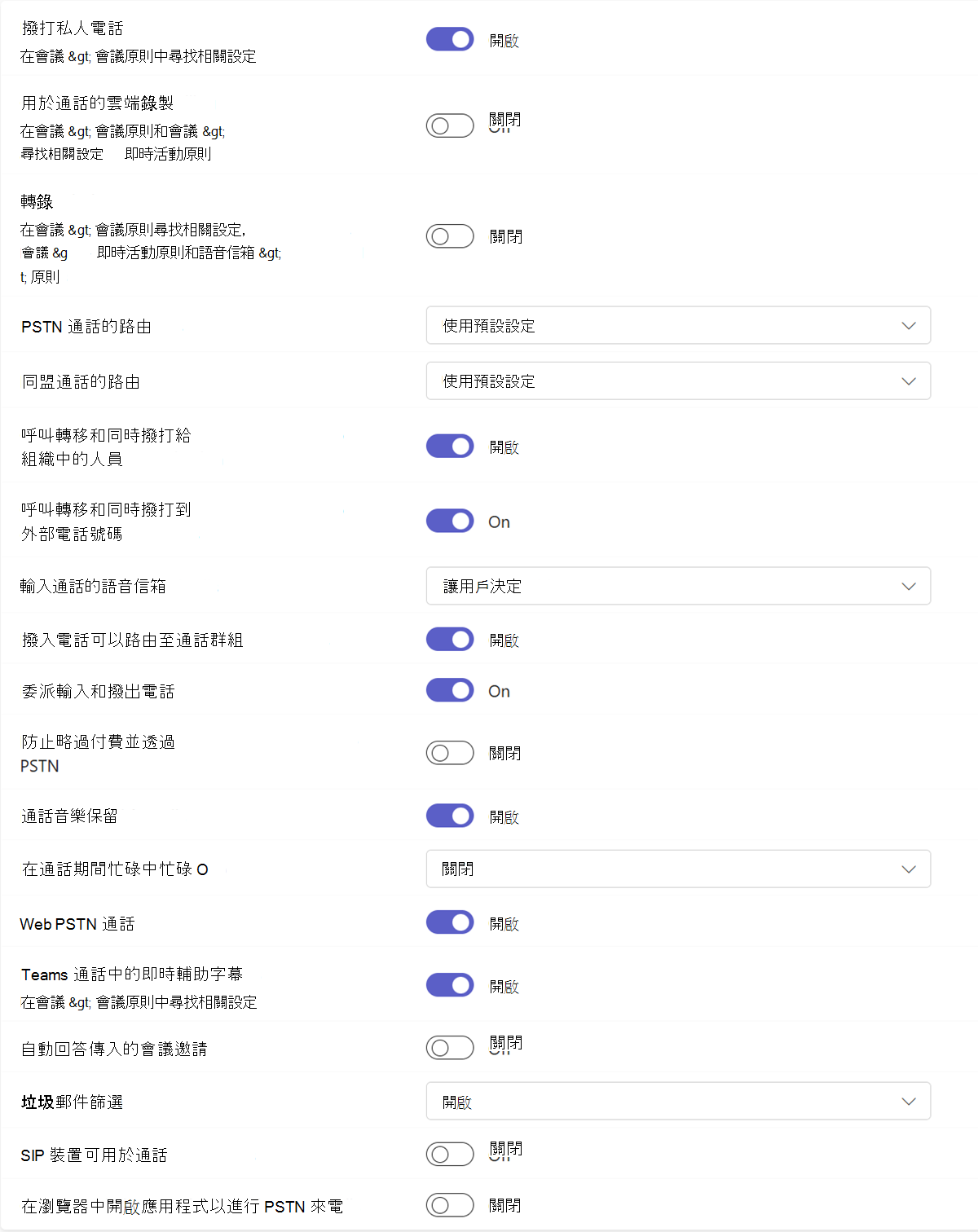 | 端對端通話加密 | 未啟用 | 此設定決定使用者是否能提供端對端加密通話。 閱讀更多關於 如何設定端對端加密以進行一對一 Microsoft Teams 通話的資訊。 |