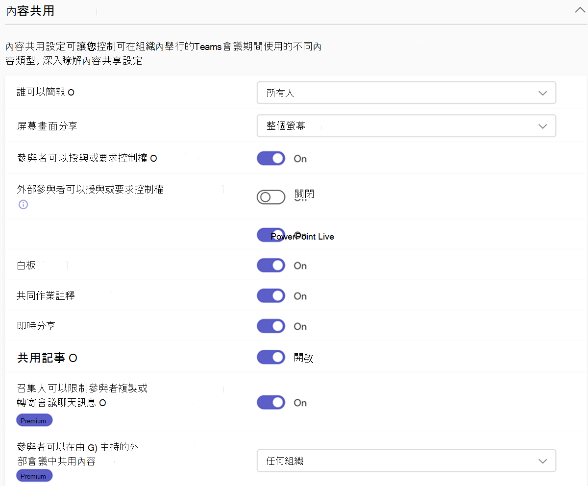 | 加入外部共享頻道 | 開啟 | 啟用時,若設定 Microsoft Entra 跨租戶存取設定,使用者與團隊可被邀請進入外部共享頻道。 |