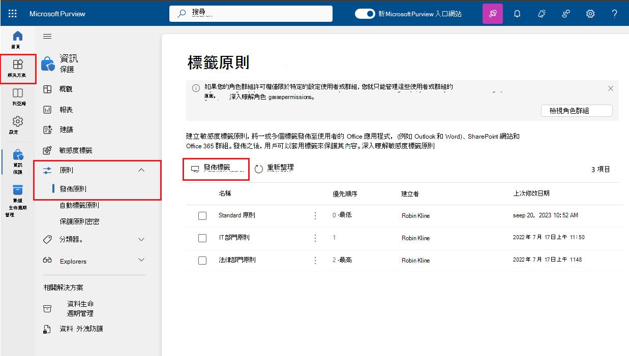 登入 Microsoft Purview 入口網站>解決方案>資訊保護>敏感度標籤