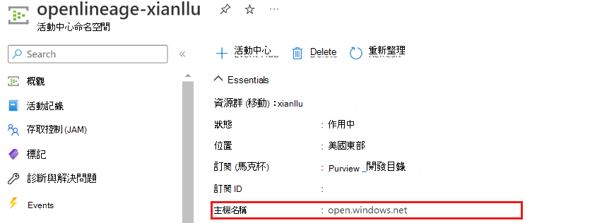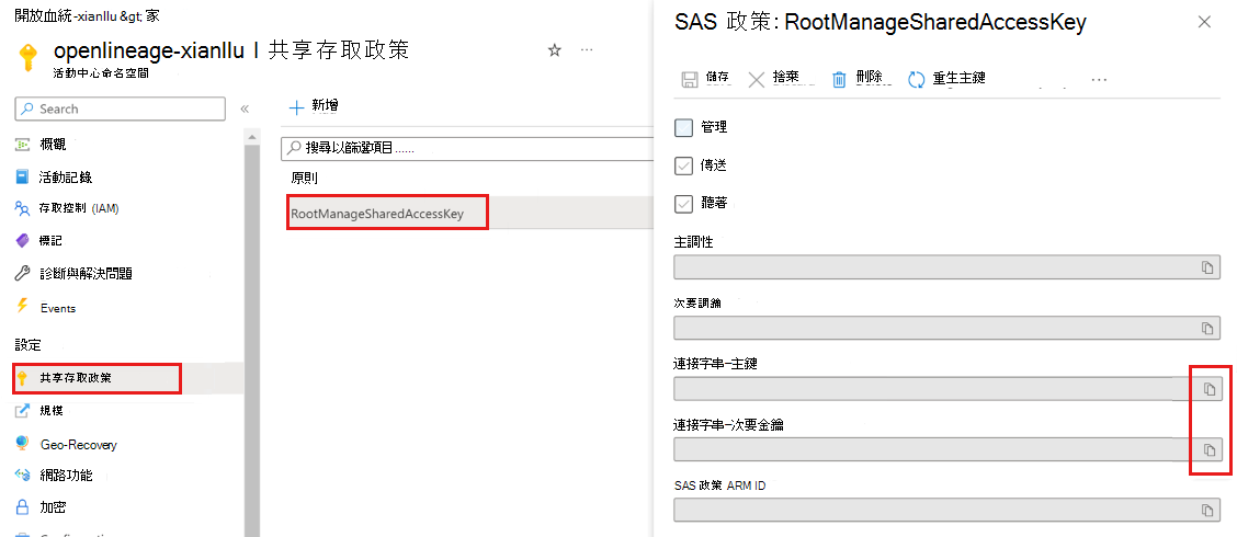 接下來,將您的 Azure 事件中樞執行個體設定為 OpenLineage 傳送事件的目標。
