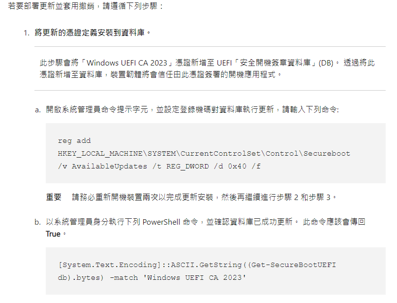 - 將註冊表項 設置為 Set-ItemProperty -Path “HKLM:\SYSTEM\CurrentControlSet\Control\SecureBoot” -Name “AvailableUpdates” -Value 0x40