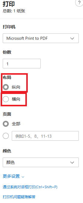 只有两个打印方向可以通过 Edge 完成,但是如果您说到不同的打印选项,您可以进入更多详细信息或获取您所讲选项的截图吗?