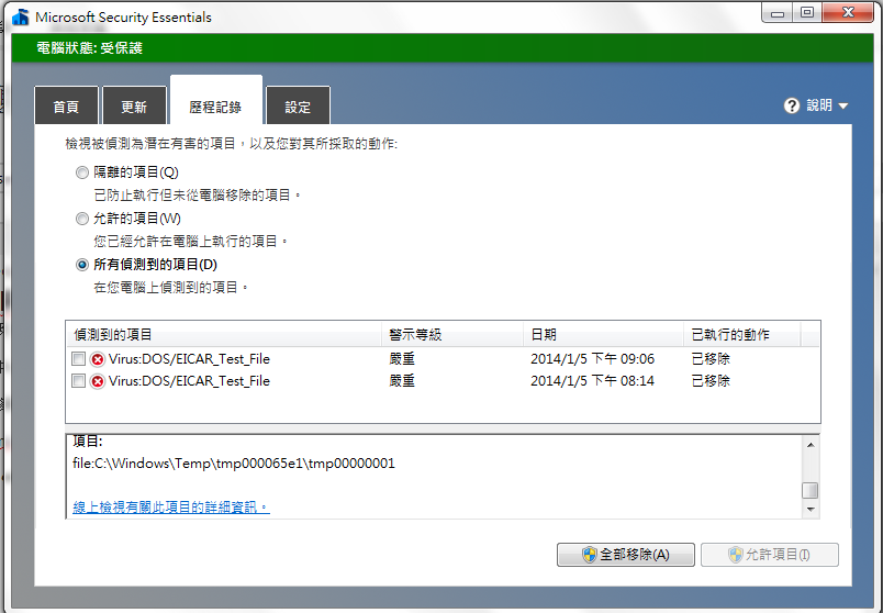 最近我的microsoft security essentials一直偵測出病毒,它叫: DOS/EICAR_Test_File