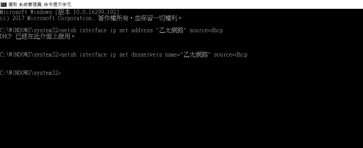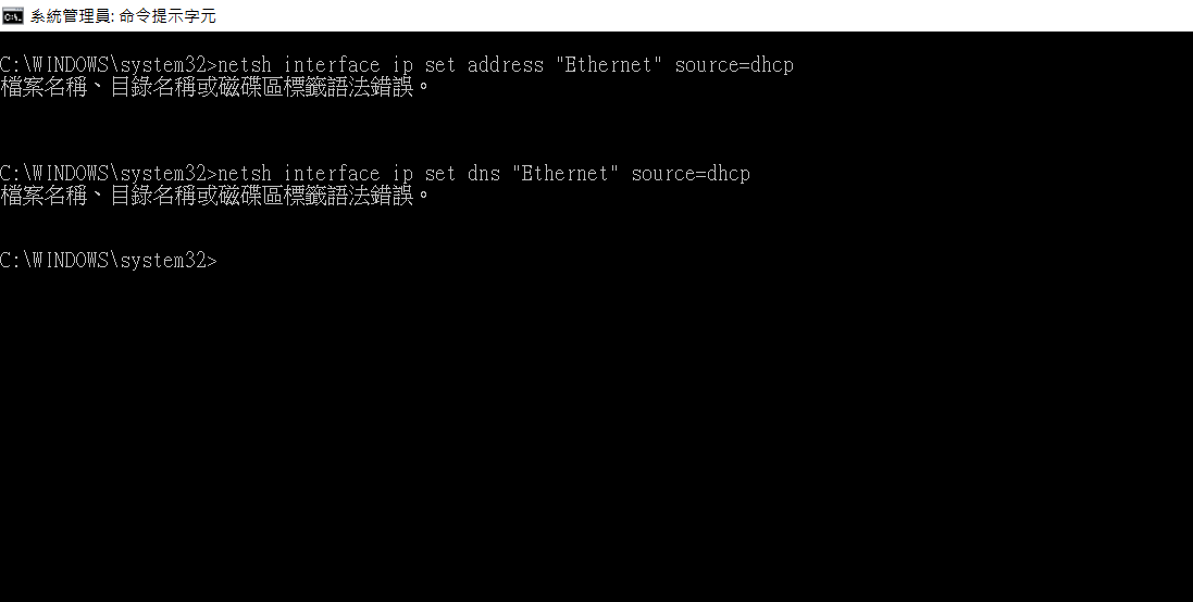 netsh interface ip set dns "Ethernet" source=dhcp