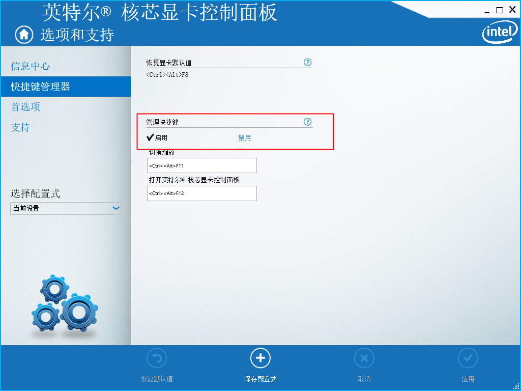 Answer accepted by question author 匿名 2018-01-15T05:28:53+00:00 您好, 右鍵點擊桌面,應該有一個顯示卡logo 類似的圖標, 點進去之後調整設定。 例如這邊的Intel 顯示卡設定,不要禁用。 請登入以對此回答評等。 Yes No 有 1 人認為此回答有所幫助。 0 則留言 沒有留言 回報問題