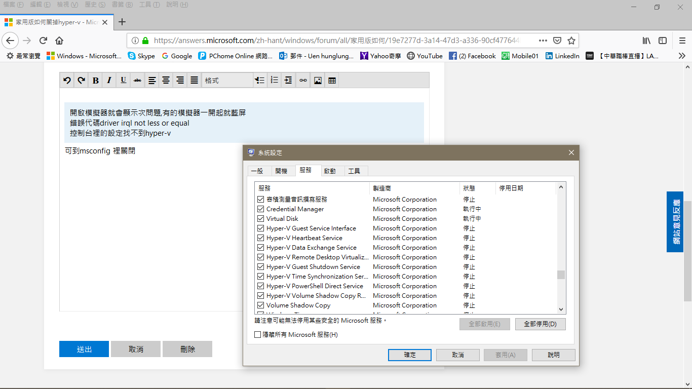 我嘗試了,我到msconfig也找不到hyper-v的些選項
