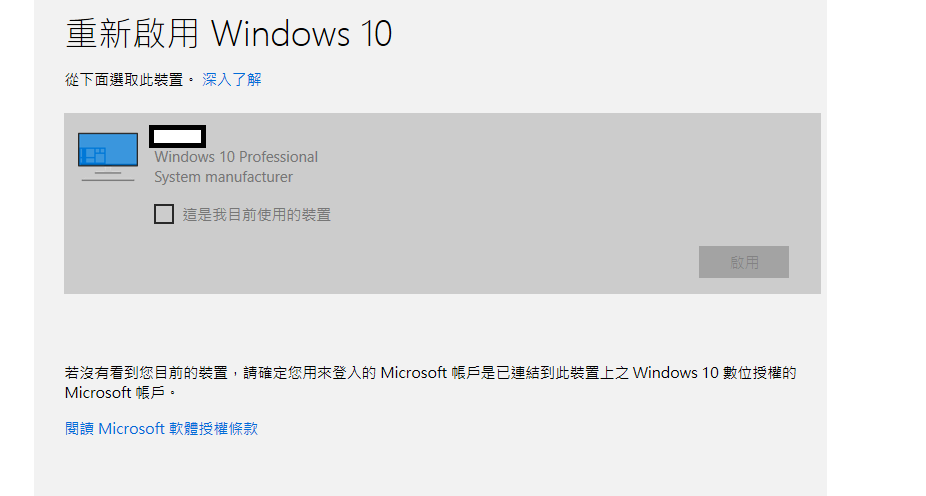 也就是說,操作就是選中要轉移數位授權的舊電腦,之後啓用,將舊電腦的數位授權轉移到新電腦上。