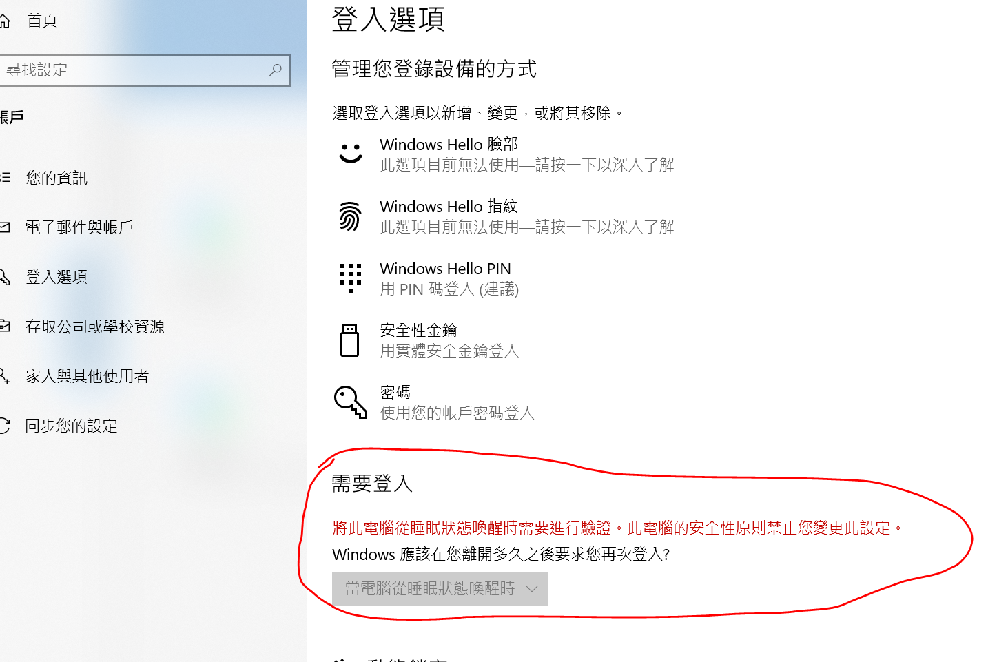 在登入選項中:電腦從睡面狀態還醒時需要驗證,且禁止我變更設定,