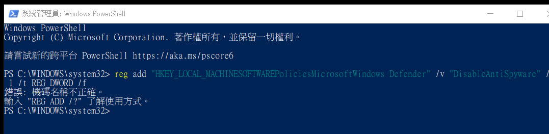 reg add "HKEY_LOCAL_MACHINESOFTWAREPoliciesMicrosoftWindows Defender" /v "DisableAntiSpyware" /d 0 /t REG_DWORD /f,按回車